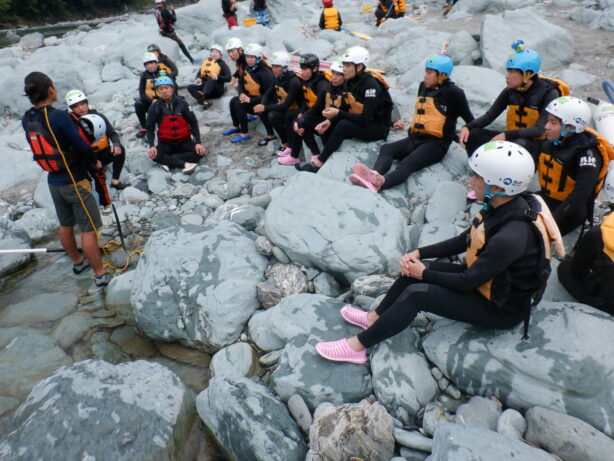 RAJ取得後はお客様を川へ連れていくためのトレーニングに入ります。お客様を安全にお迎えし、激流を安心して楽しんでいただけるよう、実践的なスキルを身につけます。この段階では、最も重要なお客様をお連れするための安全管理技術や、ガイドとしてのノウハウ、各応対方法を学ぶ段階となります。