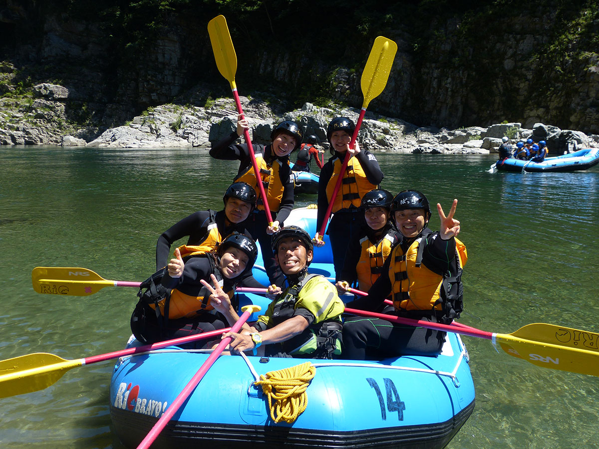今日はラフティング日和、夏晴れの吉野川に笑顔が映える。