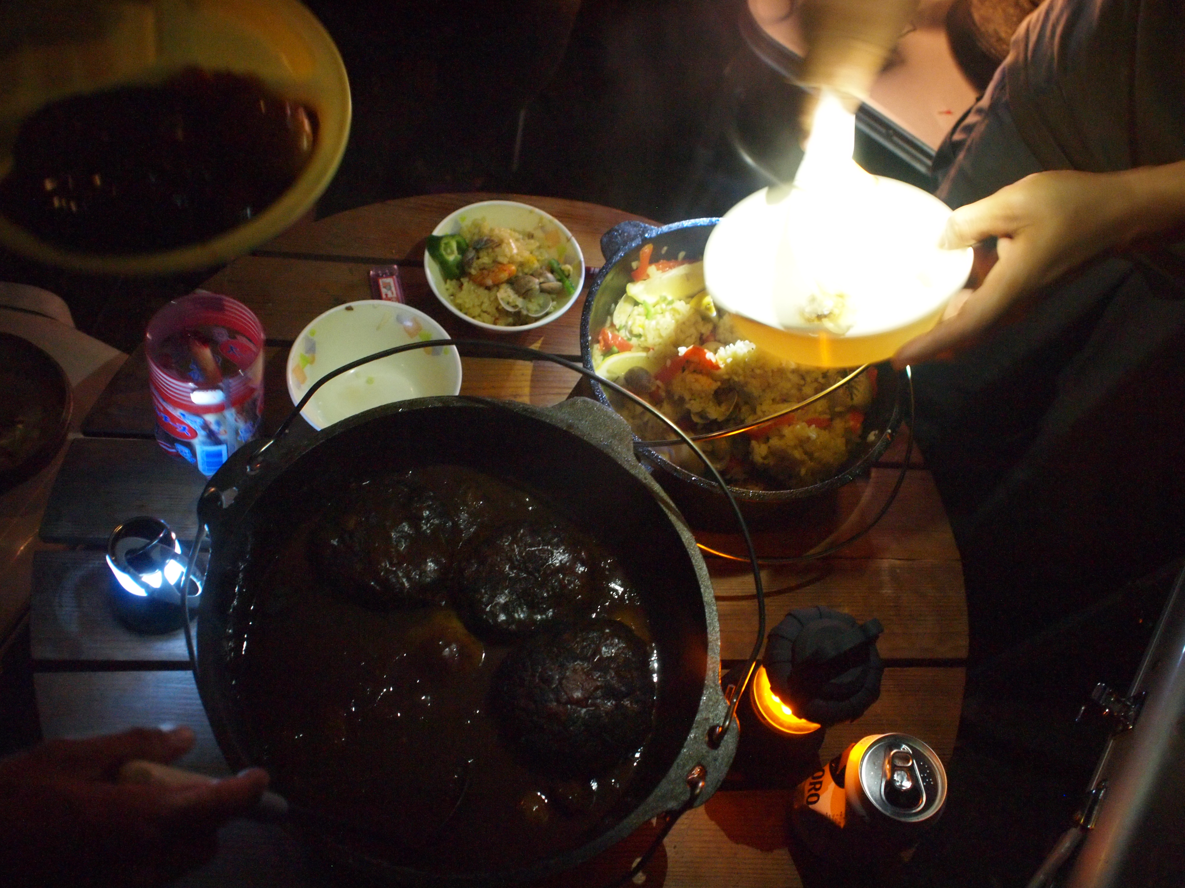 屋外で本格的なダッチオーブン料理。夜は参加者・ガイドでワイワイとお酒でも飲んで親睦を深めましょう♪