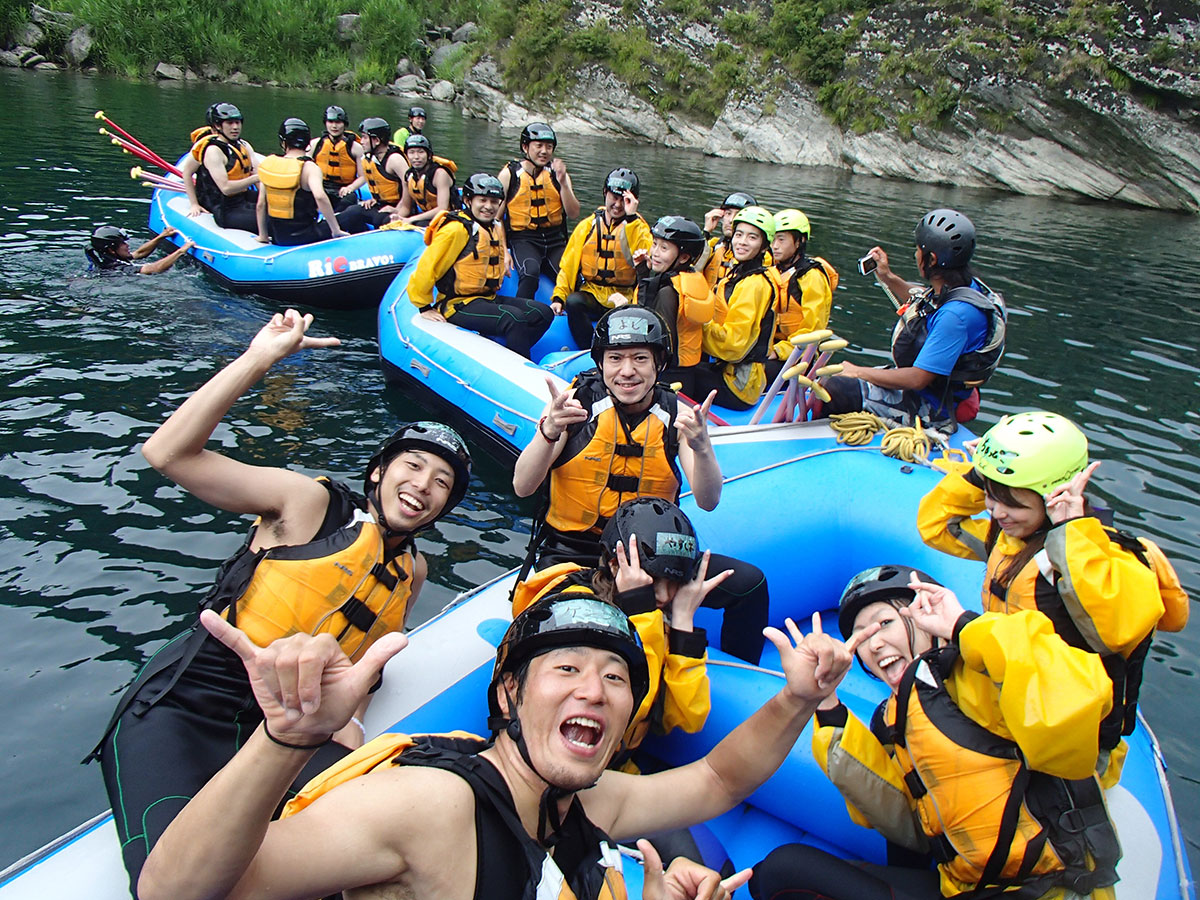 本日の午後ツアー参加のみなさま。 みんな気合入ってますよ!! いつでも掛かって来いとばかりに このポーズ!! こちらは「押すなよ、押すなよ」 もちろん、押しますよ~(笑) 笑って騒いで、たくさん遊んだね。 暑い夏、熱い夏、まだまだ終わらない。 吉野川最高! てつ、ぼぼ、しゃっく、たいしょー、ぴー