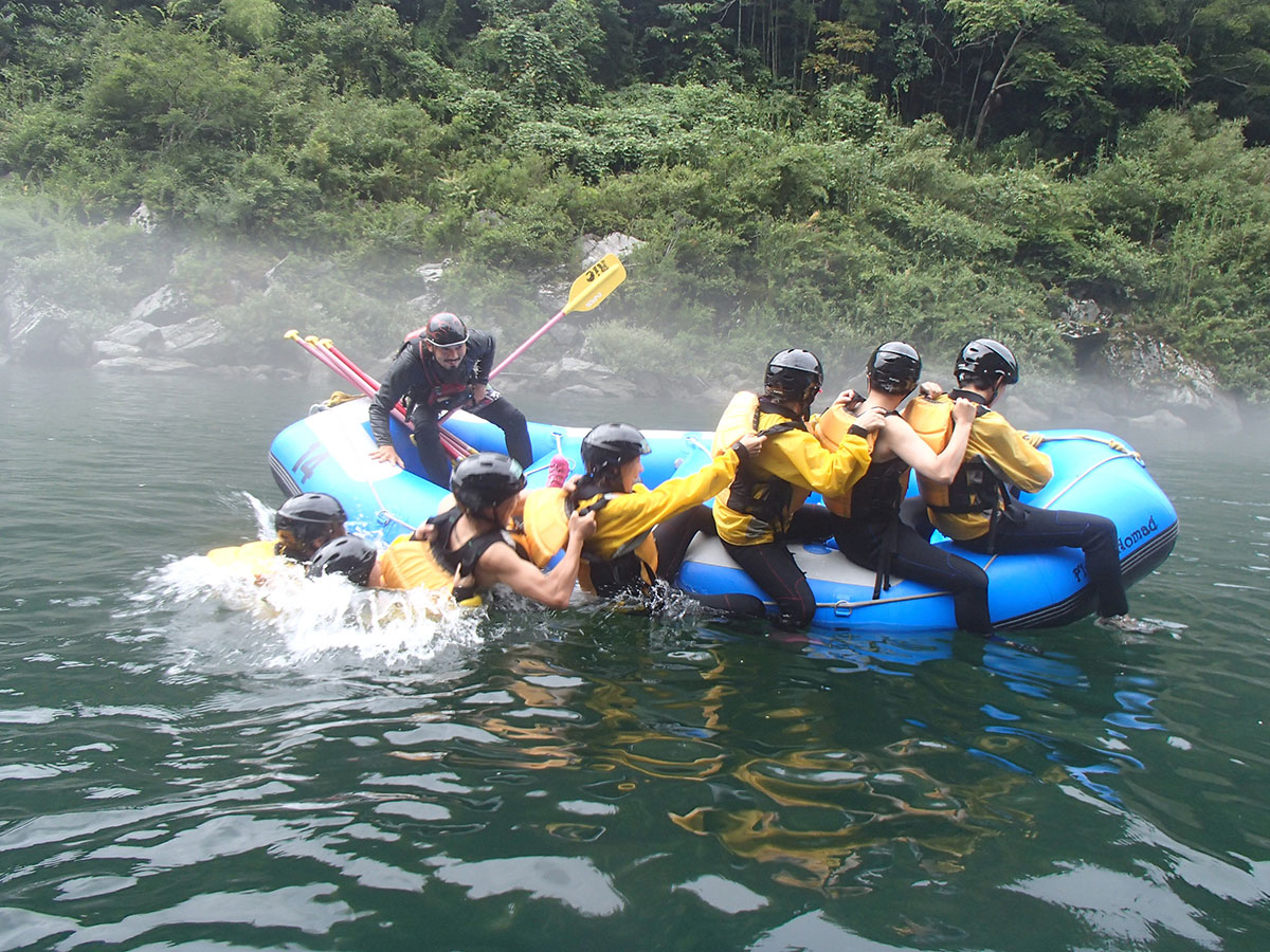 吉野川ラフティング を提供するリオブラボー! 四国の徳島県と高知県をまたいで流れる吉野川 。本当にリオブラボー!(川 最高!)なんです! 視界を遮るほどの豪雨の中、 濁流へと立ち向かう本日のゲスト達。 激流もいつも以上に激しく ボートが大波に包まれております。 とーってもレアな濁流ラフティングを体験した面々。 心なしかたくましく感じられます。 P・SHIBAYAN・YOSSY・DT