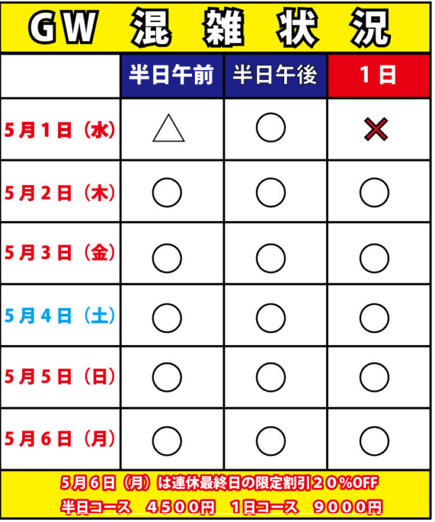 GWの混雑状況ですがまだ全体的にツアーの空きはございます。直前のご予約や空きがあれば当日のご予約も対応しています。手軽なお出かけ感覚でご利用もできます。大人数の場合はお電話でお気軽にお尋ねください。