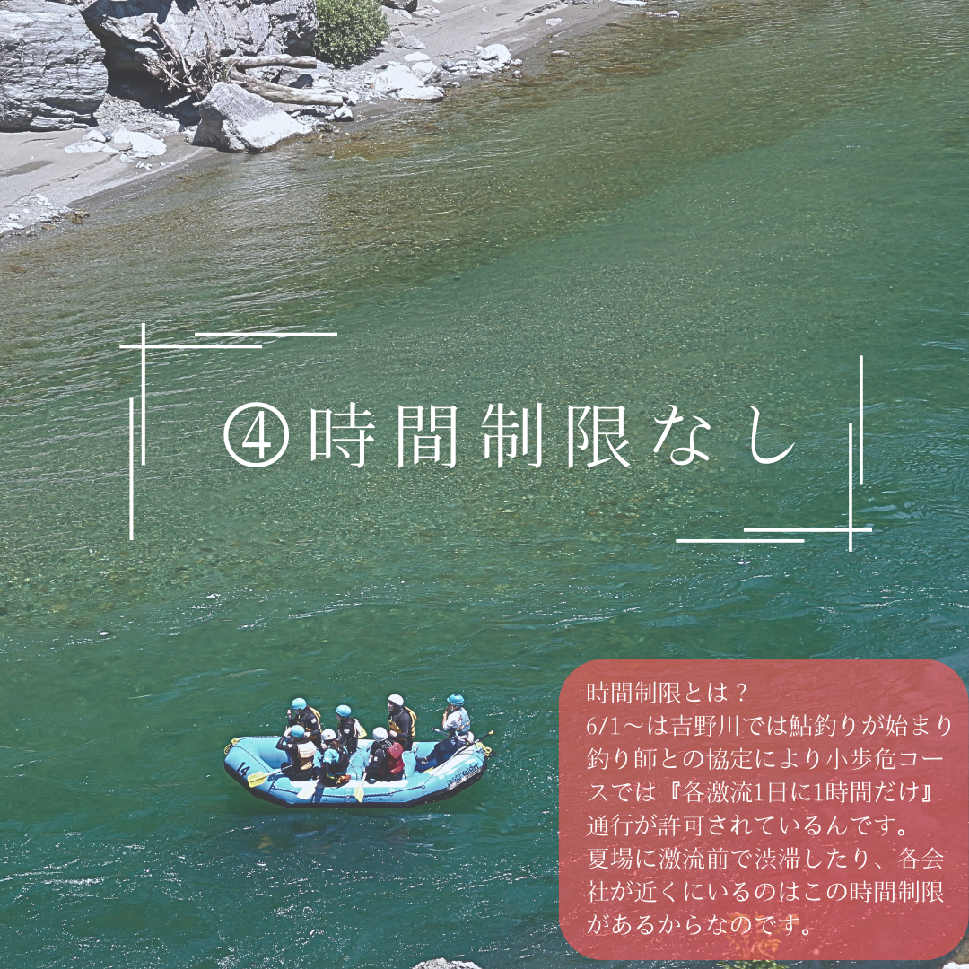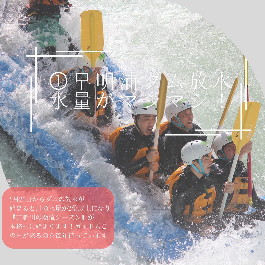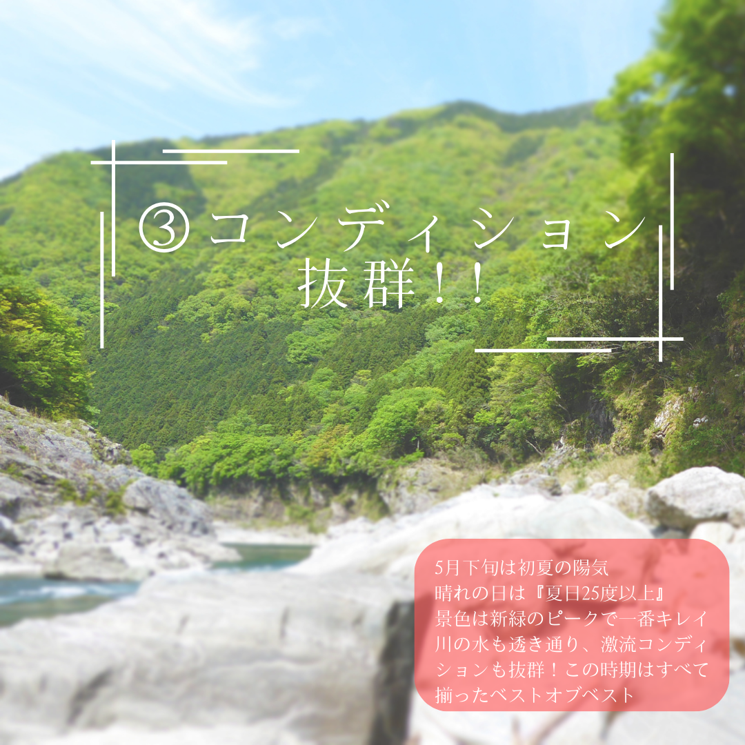 この期間は6月1日から始まる『鮎釣り』シーズン前で釣り師とラフティング業者の結んでいる時間協定がない季節なので時間制限なくゆったり遊べます。水量が多く激流コンディションも最高、天気・気温ともに最高、川も混雑していないからあわてなくてもOK。この10日間しかない川のGWは一年で一番1日の小歩危コースが楽しめる期間。この機に遊ばずしていつ遊ぶのか?水が増えるタイミングガイドもウズウズして待ってます。