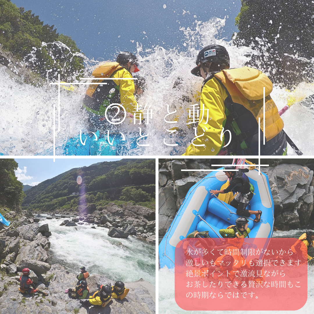 天気も良く気温も上がる季節なので激流以外にもお茶をして自然の中でのんびりしたり『静と動』どちらもお得に楽しめます。