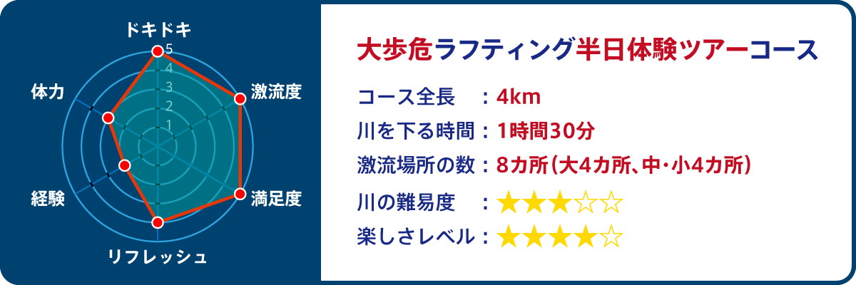 ツアーの時間は1日コースに比べて短く川にいる時間は2時間。集合から解散までが3時間半となっています。短い時間ですが、激流、川遊び、のんびりとした時間、飛び込みジャンプなど内容は満載です。午前・午後1日2回開催されているのでお客様の遊び方、旅の行程に組み合わせやすいです。