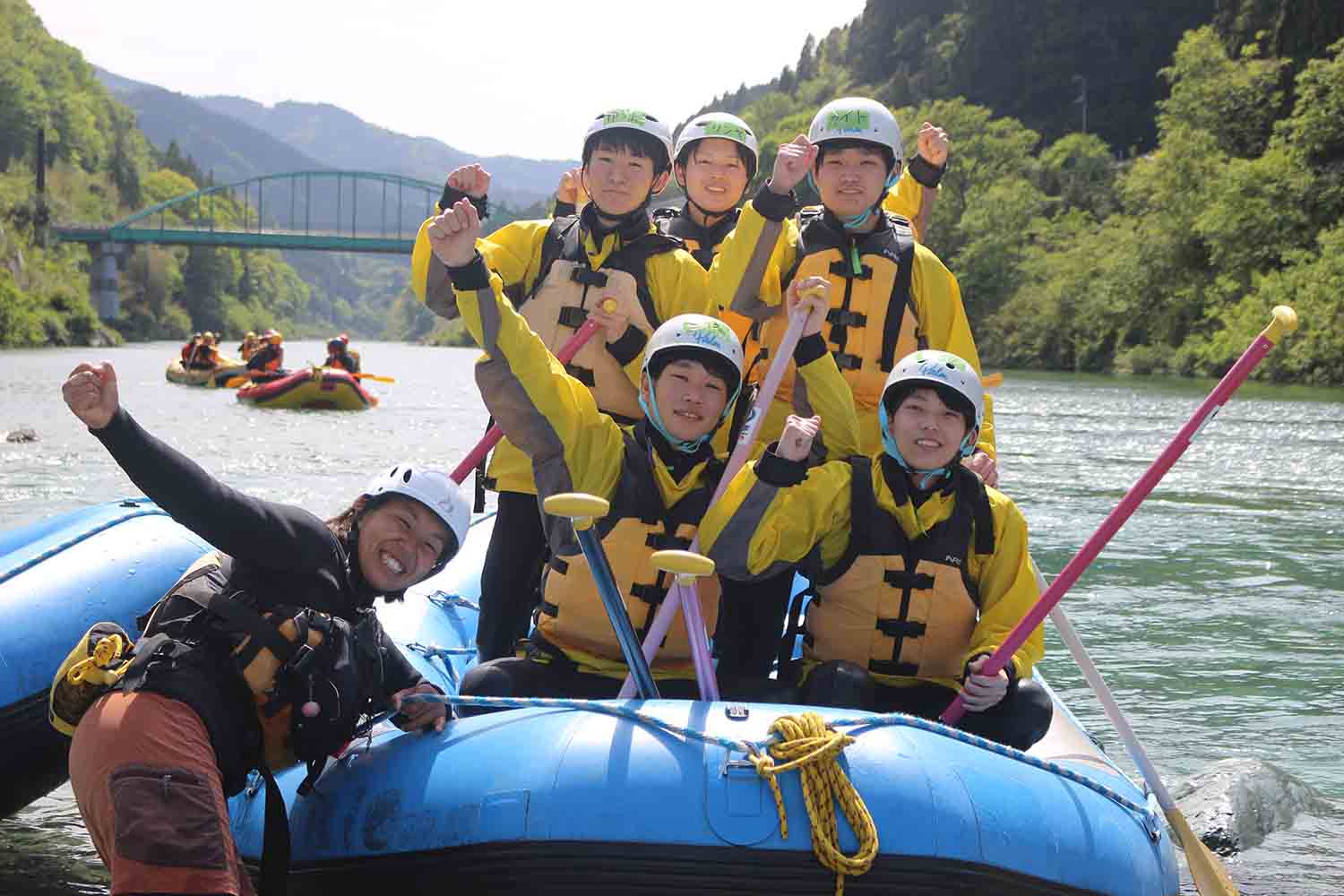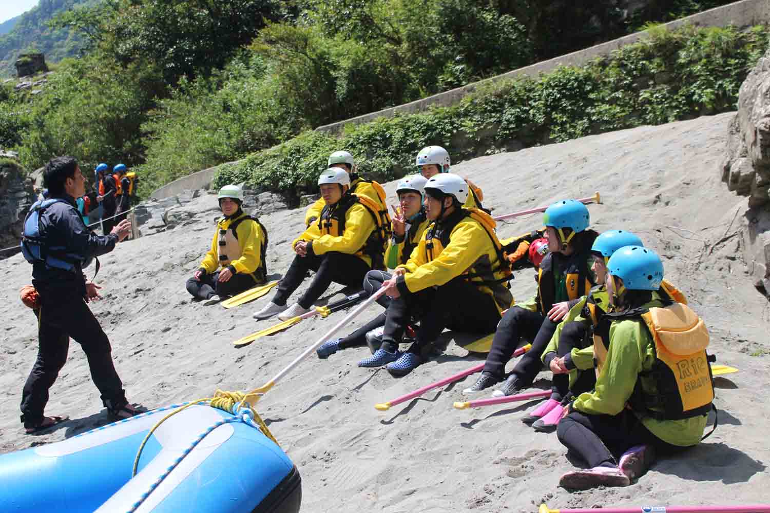 - 各ツアーには必ず社団法人ラフティング協会(RAJ)で定められてシニアガイド認定を受けたものがツアーのリーダーとしてつきます。