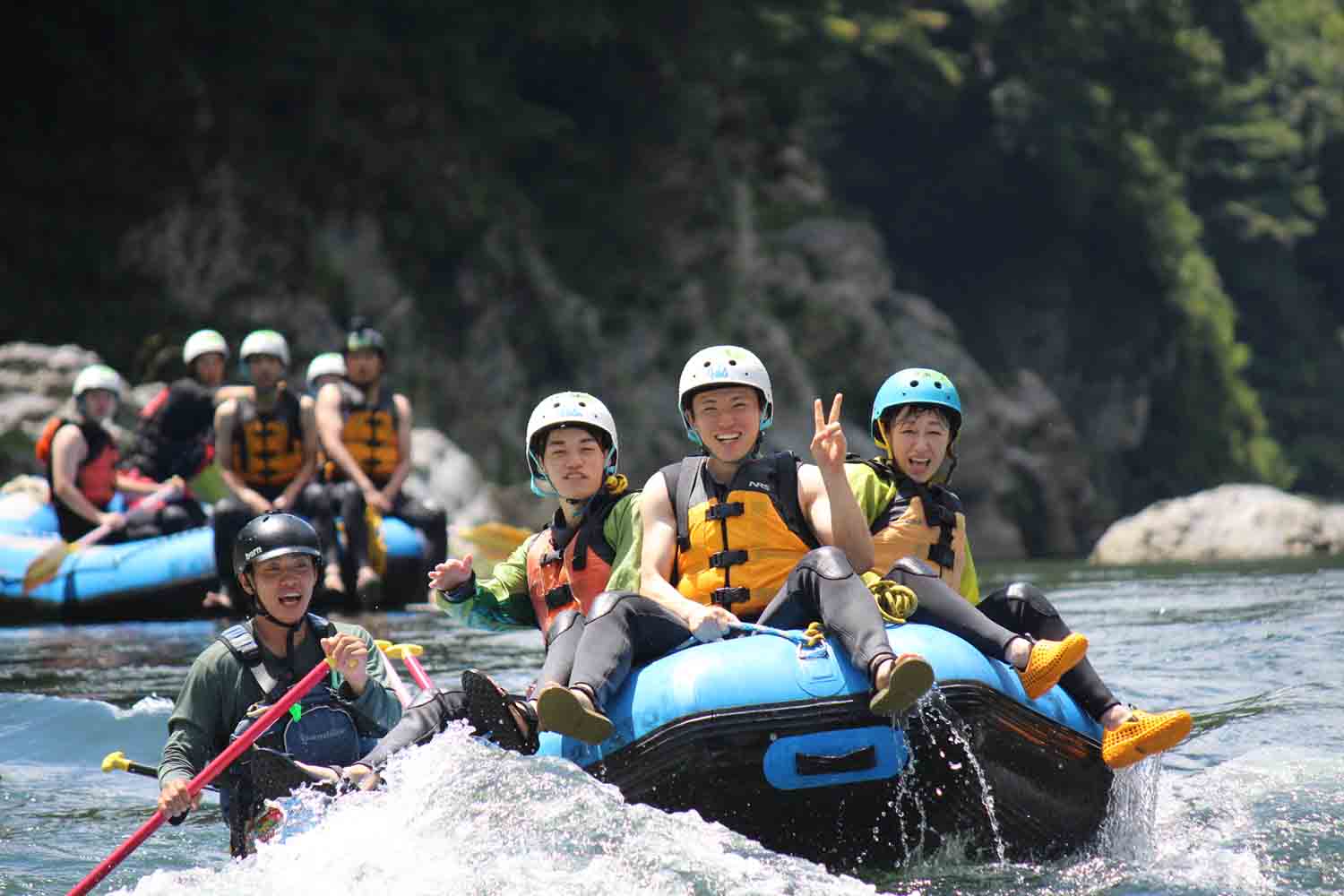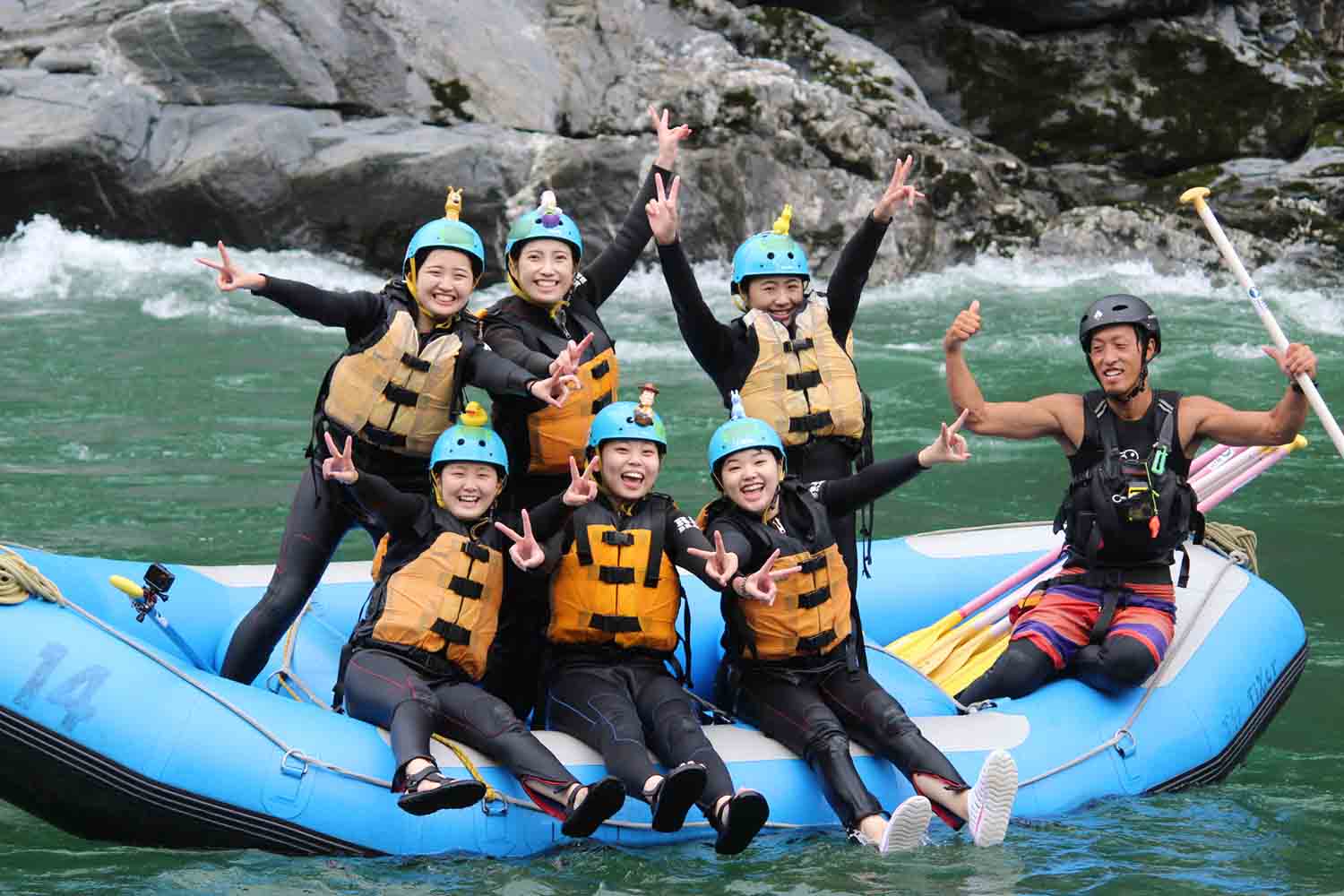 ツアー開始前は必ず安全の説明・練習をしていきます。全長約4㎞のコース・大4つ、中4つの激流を漕ぎ進み、川でプカプカ浮かび、水かけ・ボート遊び、岩場からの飛び込みに挑戦しながら、約1時間30分かけて遊んでいきます。