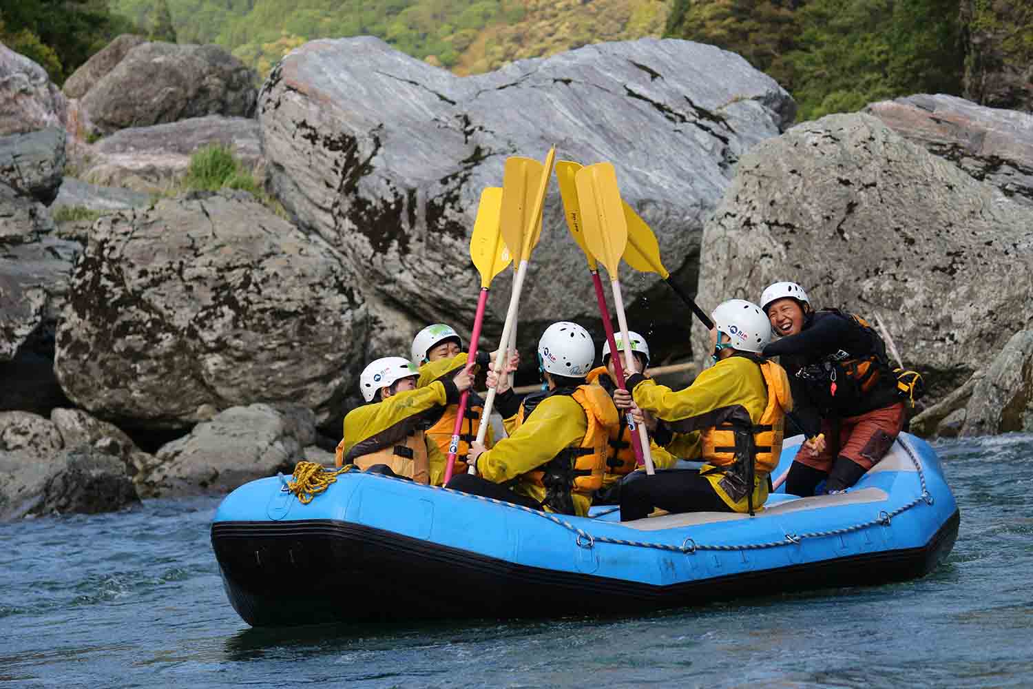- 当社のガイドは社団法人ラフティング協会(RAJ)及び自社の規定するガイドラインを満たしたもののみがガイドを行います。